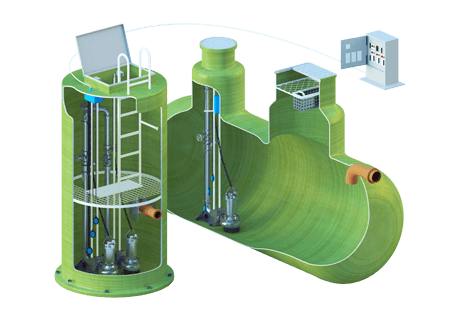 Кәріздік сорғы станциясының корпусы арматураланған шыны талшықтан жасалған немесе Тапсырыс берушінің техникалық талаптарына сәйкес цилиндрлік резервуар болып табылады.
