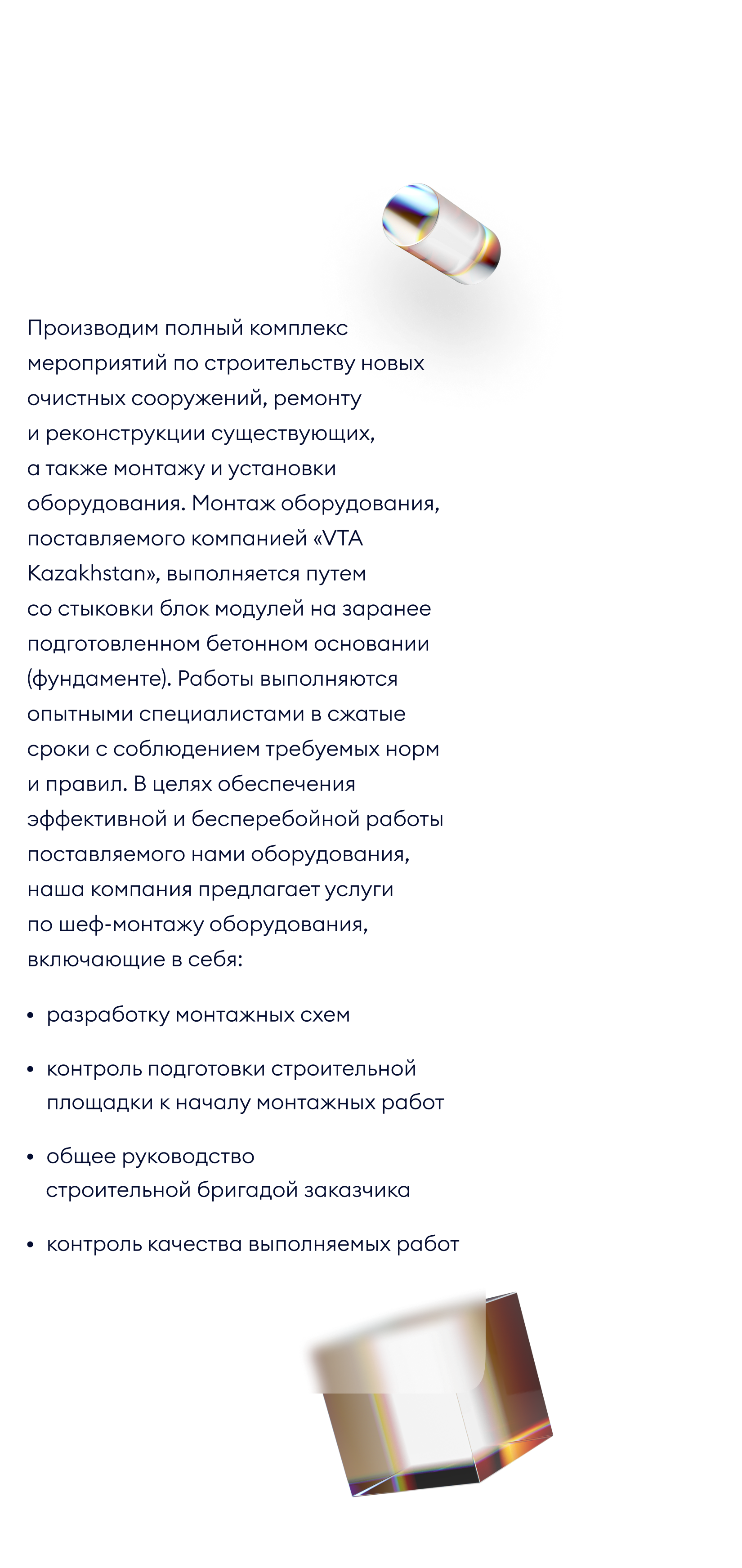 Біз жаңа тазарту құрылыстарын салу, жұмыс істеп тұрғандарын жөндеу және қайта жаңарту, сондай-ақ жабдықтарды орнату және орнату бойынша іс-шаралардың толық кешенін жүзеге асырамыз. SUECO жеткізген жабдықты орнату блоктық модульдерді алдын ала дайындалған бетонды негізге (іргетас) қондыру арқылы жүзеге асырылады. Жұмыстарды тәжірибелі мамандар қажетті нормалар мен ережелерді сақтай отырып, қысқа мерзімде жүргізеді. Біз жеткізген жабдықтың тиімді және үздіксіз жұмысын қамтамасыз ету үшін біздің компания жабдықты орнатуды қадағалау қызметтерін ұсынады, соның ішінде: