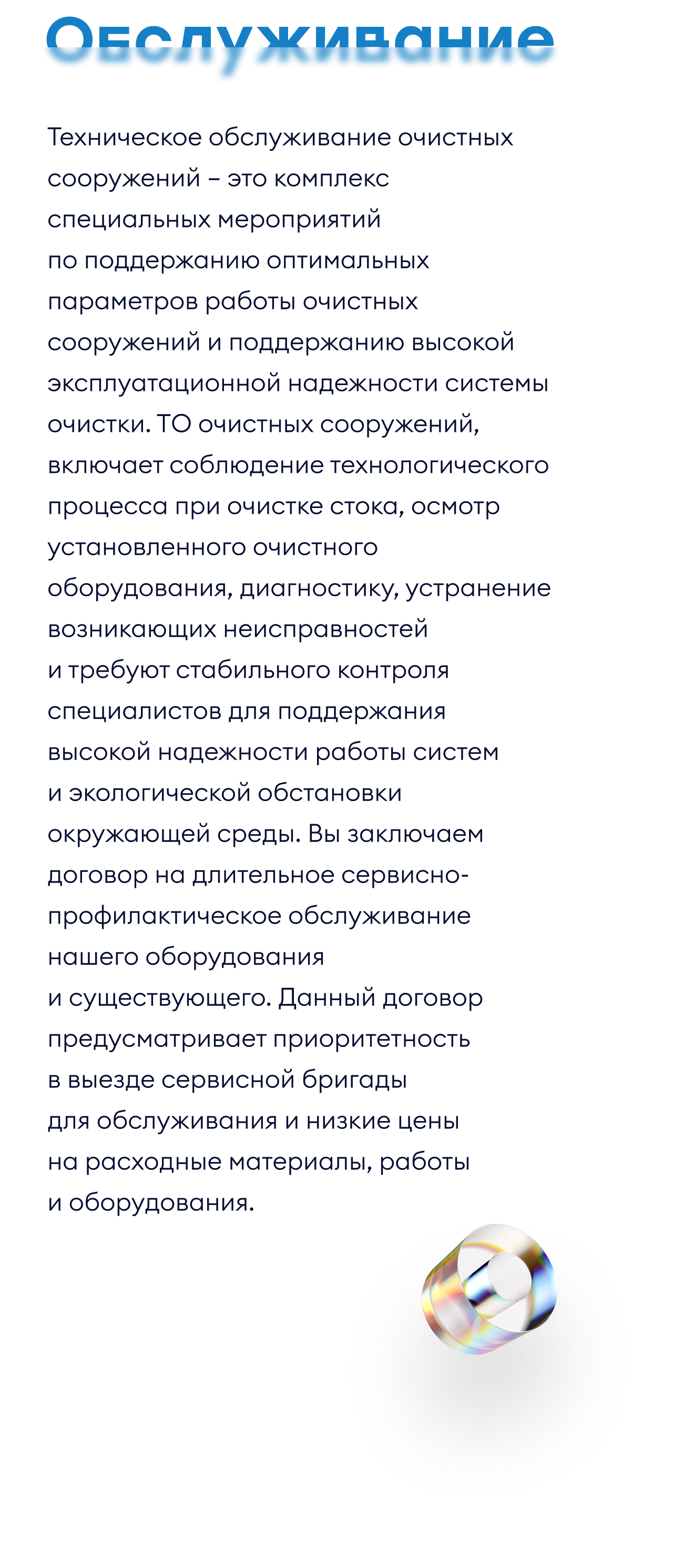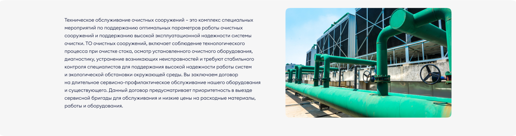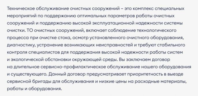 Техническое обслуживание очистных сооружений - это комплекс специальных мероприятий по поддержанию оптимальных параметров работы очистных сооружений и поддержанию высокой эксплуатационной надежности системы очистки. ТО очистных сооружений, включает соблюдение технологического процесса при очистке стока, осмотр установленного очистного оборудования, диагностику, устранение возникающих неисправностей и требуют стабильного контроля специалистов для поддержания высокой надежности работы систем и экологической обстановки окружающей среды. Вы заключаем договор на длительное сервисное- профилактическое обслуживание нашего оборудования и существующего. Данный договор предусматривает приоритетность в выезд сервисной бригады для обслуживания и низкие цены на расходные материалы, работы и оборудования.